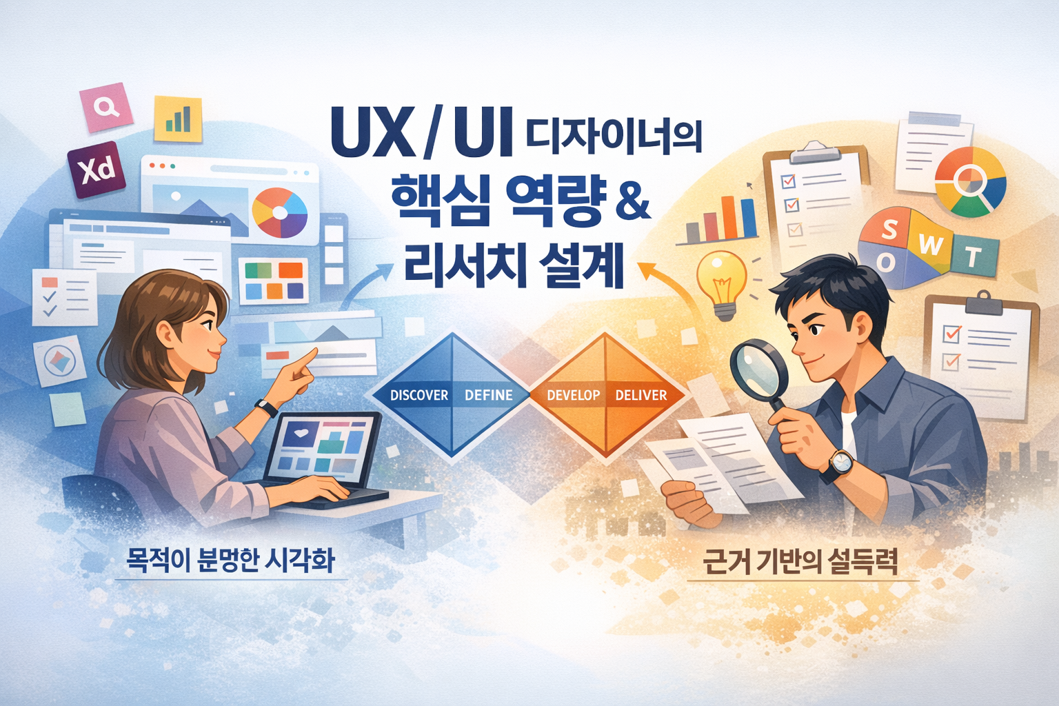 UX/UI 디자인에서 가장 중요하게 요구되는 핵심 역량은 단순히 화면을 예쁘게 만드는 능력이 아니다. 실제 실무에서는 왜 이렇게 디자인했는지 설명할 수 있는 힘, 그리고 의사결정 과정이 논리적으로 설계되어 있는지가 훨씬 중요하게 평가된다. 이를 정리해보면 크게 두 가지로 나눌 수 있다. 바로 목적이 분명한 시각화, 그리고 근거 기반의 설득력이다.